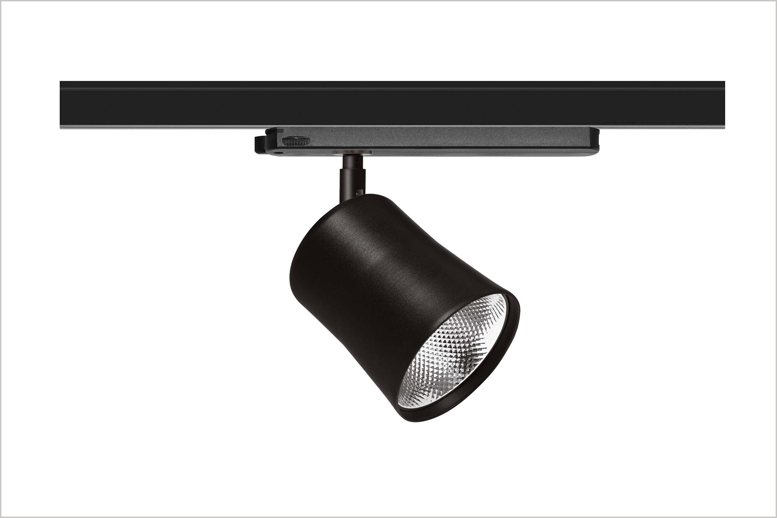 Adjustable track-mounted LED projector, exchangeable optics. Beam SP/ST/MD/LA