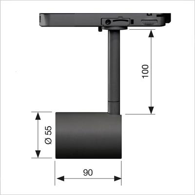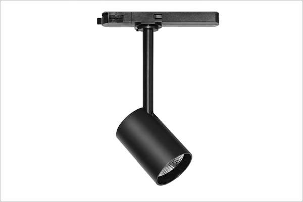 Adjustable track-mounted LED projector, exchangeable optics.