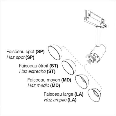 Metallized polycarbonate louver wide beam (code LA) medium beam (code MD) narrow beam (code ST) spot beam (code SP).
