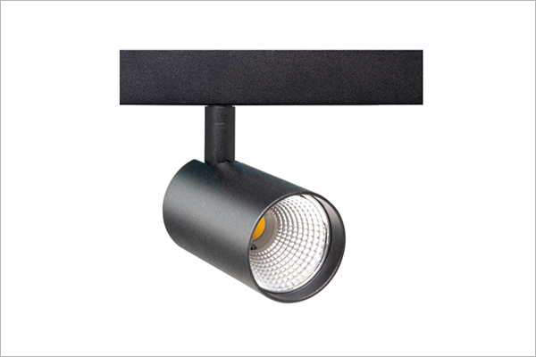 Proyector LED orientable montado en riel de 48 voltios.