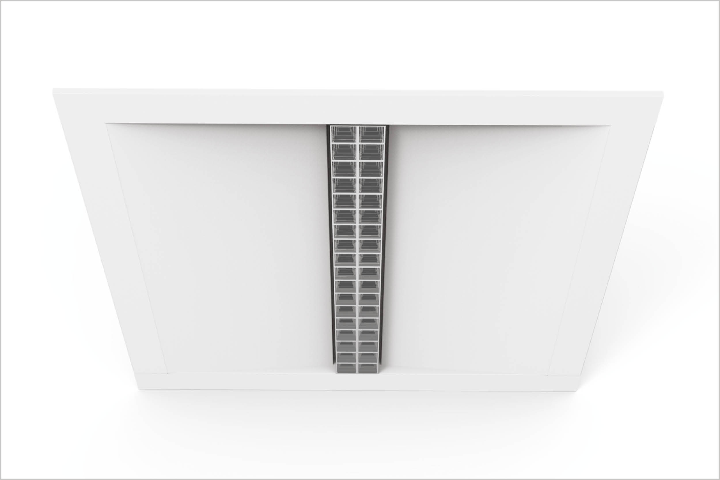 Installation standard sans outils par encastrement en appui sur la structure portante apparente des faux-plafonds 600x600mm, avec son cadre TLC3 pour les plafonds en contre-plaqué, ou accessoire de suspension/plafond KTPIT7. Source lumineuse LED.