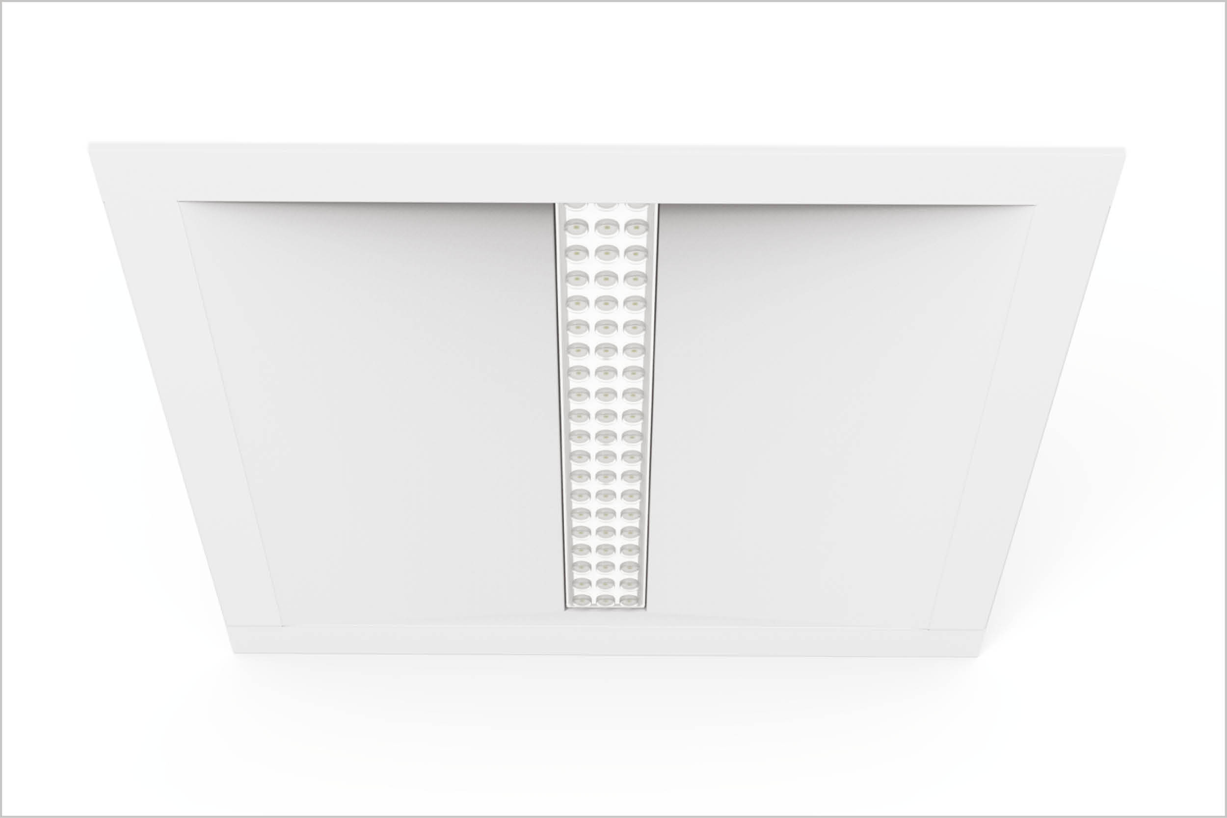 Installazione standard ad incasso in appoggio in controsoffitti 600x600 mm con struttura portante a vista senza l’utilizzo di accessori, in